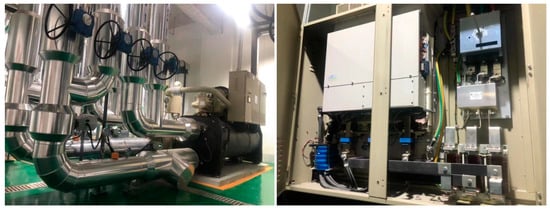 - Transitioning from a district boiler heating system to a water-source heat pump heating system utilizing a low-temperature heat source (20 °C), which is the cooling water from nearby factories. Figure 1 shows a schematic diagram of the water-source heat pumps, and Table 1 exhibits the main parameters of the employed heat pump units.