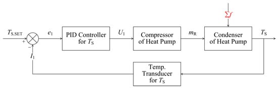 - A single-loop PID controller was employed with the control variable of the condenser outlet water temperature. Figure 3 shows the structure of this control system. As seen from Figure 3, the set value of condenser outlet water temperature (TS.SET) minus the measurement (I1) of that is the deviation (e1) of the controlled variable, which is sent to the PID controller. Through calculations, the PID controller sends the adjustment signals (U1) to the electric motor of the compressor, regulating the refrigerant flow rate (mR) to manage the heat exchange capacity of the condenser for changing its output water temperature (TS).