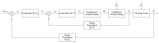 As Figure 4 shows, the set value of return water temperature (TR.SET) minus the measurement (I1) of that is the deviation (e1) of the controlled variable, which is sent to the controller for TR. Through calculations, the controller for TR outputs the signal U1, then the signal U1 minus the measurement (I2) of condenser outlet water temperature is the deviation (e2) of the secondary controlled variable, which is sent to the controller for TS. Through calculations, the controller for TS sends the adjustment signals (U2) to the electric motor of the compressor, regulating the refrigerant flow rate (mR) to manage the heat exchange capacity of the condenser for changing its output water temperature (TS). Ultimately, heating users respond to TS and output the return water temperature (TR).