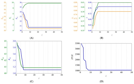 The tuning process of eight controller structural parameters. (A) The tuning process of KP1, KI, and KD1. (B) The tuning process of μ1, μ2, and λ. (C) The tuning process of KP2 and KD2. (D) The optimizing process with ITUE.
