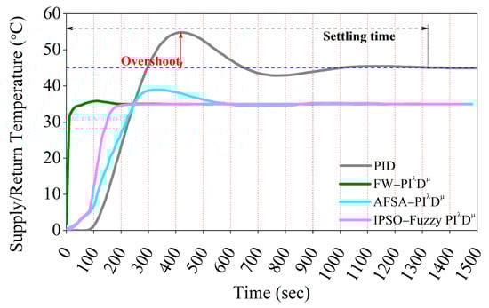 Figure 9 displays the unit-step response test results of different control schemes for managing the heating temperatures. As shown in Figure 9, the oldversion of the control system (with the supply water temperature as the controlled variable) possesses a time lag of more than 80 s, with a significant overshoot of 22.2% and a long settling time of 1320 s. In contrast, three Smith-predicted PIλDμ cascade control systems (with the return water temperature as the controlled variable) reduce capacity lag by 37.5~100%, weaken overshoot by 61.3~100%, and shorten settling time by 54.5~84.8%. Among three Smith-predicted PIλDμ cascade control systems [25,45], the system employing the advanced fireworks algorithm exhibits apparent advantages, especially regarding response time. Note that although the particle swarm algorithm combined with fuzzy rules [25] achieves zero overshoot, the advanced fireworks algorithm outperforms it in the capacity lag (reduced by 65 s) and adjustment time (shortened by 50 s) restraint.