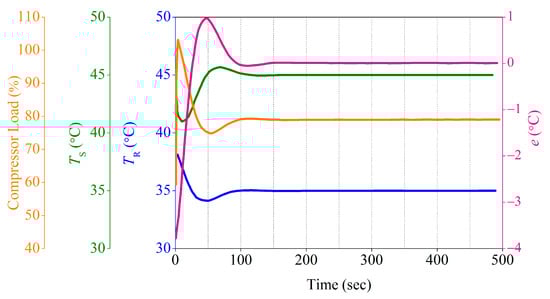 Figure 10 exhibits the response curves of the return water temperature and its deviation, as well as the supply water temperature and compressor speed, during the adjustment of heating water temperatures. As seen from Figure 10, after the adjustment starts, the deviation of the return water temperature peaks at 48 s and stabilizes at around 100 s; the return water temperature reaches its minimum value at 50 s and stabilizes at around 100 s. The compressor speed reaches its peak within 0.9 s after receiving the downward adjustment command, reaches its minimum value at 50 s, and stabilizes at around 100 s, while the supply water temperature reaches its minimum value within 9.7 s after receiving the downward command and tends to stabilize at around 100 s. Although there is resistance and hysteresis in each stage of the regulation process, the upgraded control system effectively compensates for such adverse impacts.