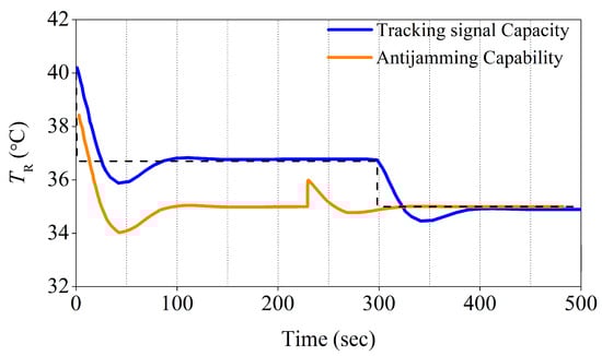 Further, to verify the tracking performance of the upgraded control system, the initial return water temperature and its set value are configured by 40.0 °C and 36.5 °C, respectively. Then, the set value of the return water temperature is reset to 35.0 °C at 298 s in the test. After that, to verify the anti-interference performance of the upgraded control system, the initial return water temperature and its set value are configured by 38.5 °C and 35.0 °C, respectively. When the system’s running time is 228.9 s, insert a transient interference signal of 36.0 °C.