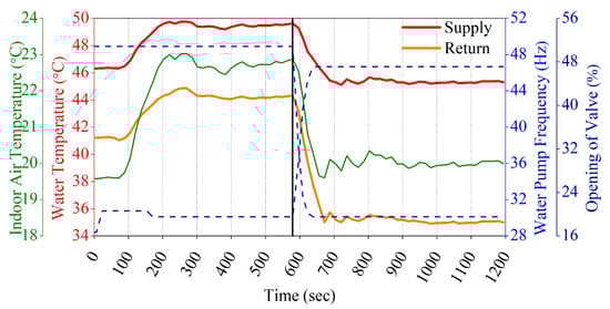 Figure 11 presents the return water temperature response curve in tracking and anti-interference performance tests. As shown in Figure 11, after the regulation starts, the return water temperature reaches the minimum value at 48 s and stabilizes at 100 s. When a disturbance of 1 °C temperature rise is applied at 228.9 s, the return water temperature reaches the minimum value at 278.8 s and stabilizes at 309.3 s. Such results verify that the upgraded control system can track and resist interference for the return water temperature.