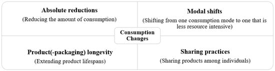 Sufficiency can entail different consumption changes that deviate more or less from the social mainstream [19,32]. Sandberg’s typology [19] allows such a distinction (see Figure 1). The first type of consumption change represents an absolute reduction in consumption. In the context of packaging avoidance, this can include packaging-free shopping. Secondly, there can be changes in modal shifts, which means that previous consumption practices are changed to less resource-intensive ones. This is, for example, the consumption of low-packaging goods. The third type of consumption change involves the consumption of durable goods. Since packaging can also be counted as a consumer good, we have adapted the type to “product(-packaging) longevity”. Fourth, practices may shift toward collaborative consumption, such as borrowing or swapping, rather than buying a new product. Since consistency and efficiency can also lead to changes in consumers’ previous practices, we have extended the typology and used it in our study to classify sufficiency and all sustainability-related strategies.