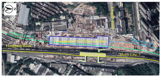 Shenzhen Metro Dayun Station is located at Longgang Road in Shenzhen, China, as shown in Figure 1. The station’s foundation pit employs an open excavation method, with a length of 304 m and a width of 51 m. The average excavation depth is 26.7 m, classifying it as a deep foundation pit project. Dayun Station is an intermediate station for Line 14 and the starting station for Line 16. The eastern side of the foundation pit is adjacent to the existing elevated station of Shenzhen Metro Line 3, with a distance of 2.1 m between the diaphragm wall of the foundation pit and the foundation pile of the elevated station.