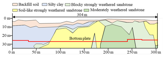 The geological profile of the foundation pit was drawn based on the geological survey results, as shown in Figure 2. The types of strata change significantly from south to north, with the geological types sequentially comprising backfill soil, silty clay, blocky strongly weathered sandstone, soil-like strongly weathered sandstone, and moderately weathered sandstone. The foundation pit is primarily located in soft soil, which is characterized by susceptibility to liquefaction and deformation under construction disturbances [16,17,18].