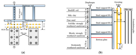 Figure 3 shows the locations of the foundation pit and the foundation piles, as well as the grouting reinforcement area. In this project, the diaphragm wall is a reinforced concrete structure. The foundation piles of the elevated bridge are grouped in sets of six and connected as a whole through pile caps. The pile caps distribute the load from the elevated station and ensure coordinated settlement and deformation of piles. Considering the construction costs and the requirements for controlling the deformation of the foundation piles, two grouting schemes were planned: single-row grouting and double-row grouting. For the single-row grouting, the first row of grouting holes is located 0.8 m from the diaphragm wall, with a grouting hole diameter of 120 mm. The grouting depth extends from the pile cap to 3 m below the bottom of the foundation piles. This depth reaches the stable bedrock layer, ensuring sufficient reinforcement of the soft soil layer. For the double-row grouting, the second row of grouting holes is 0.8 m away from the first. The distance between adjacent grouting holes is 1.5 m to ensure the grout can fully diffuse within the soil and form a continuous reinforced zone.