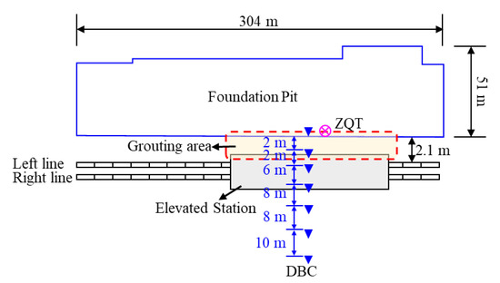 Excavation of foundation pits in densely built urban areas is considered a high-risk engineering project. Unreasonable excavation processes that lead to excessive soil deformation can potentially damage nearby structures [3,4,5]. The adverse effects of foundation pit excavation on the nearby foundation piles have received widespread attention from researchers. The horizontal displacement of the soil caused by excavation leads to additional deflection and bending moments in the foundation piles. Furthermore, the vertical displacement of the soil induced by excavation results in negative friction on the piles, which can cause uneven settlement and deformation of the superstructure [6,7,8]. In foundation pit engineering, diaphragm walls are generally used as retaining structures to support the surrounding soft soil layers and prevent groundwater seepage into the pit. During the construction process, the stability of the diaphragm wall is essential to ensure the safe excavation of the foundation pit. These issues demand effective soil reinforcement strategies. Common methods include grouting, soil mixing piles, drainage consolidation, and soil replacement techniques. Grouting reinforcement, in particular, has successfully controlled soil deformation and ensured the safety of the foundation pit and neighboring structures [9,10,11]. Fu et al. [12] derived an analytical solution for the displacement of adjacent tunnels caused by grouting reinforcement in deep foundation pits, finding that the reinforcement effect of grouting can be considered negligible at a distance of 12 m from the grouting hole. Zheng et al. [13] studied the control effects of a new grouting reinforcement technology on the damage caused by foundation pit seepage, discovering that soil grouting reduced the seepage volume by 96%. Xue [14] reported applying soil grouting to protect old buildings near foundation pits. Xiao et al. [15] explored the application of grouting rectification techniques in irregular foundation pit excavations adjacent to subway tunnels, with results indicating that this technology effectively prevents excessive deformation of the tunnel. Although many studies have reported on applying grouting reinforcement technology in foundation pit engineering, its effectiveness in foundation pit excavation projects adjacent to elevated railways has not been sufficiently studied. In addition, the displacement and mechanical effects of foundation pit excavation on nearby elevated railway structures are poorly understood, and there is limited practical experience available for reference.
