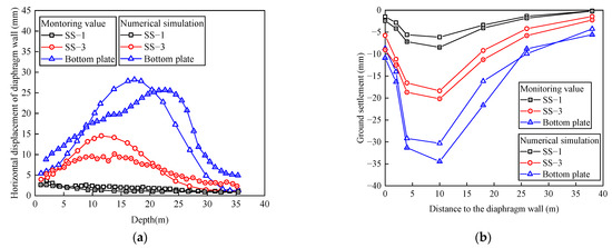 Figure 6. Comparison between numerical simulation and monitoring data: (a) horizontal displacement of the diaphragm wall; (b) ground settlement.