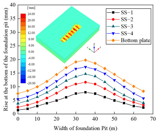 Figure 8 shows the uplift curve of the foundation pit bottom along the width of the pit. It can be observed that the maximum uplift occurs at the center of the foundation pit, while the uplift at the edges of the pit is smaller. The curve is symmetrically distributed relative to the center of the pit. As the excavation progresses, the uplift at the bottom of the pit gradually increases, reaching a maximum value of 19.8 mm when the bottom plate is installed, while the uplift at the edges of the pit is 8.4 mm.