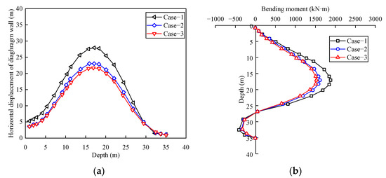 Figure 9. Mechanical response of the diaphragm wall: (a) horizontal displacement; (b) bending moment.