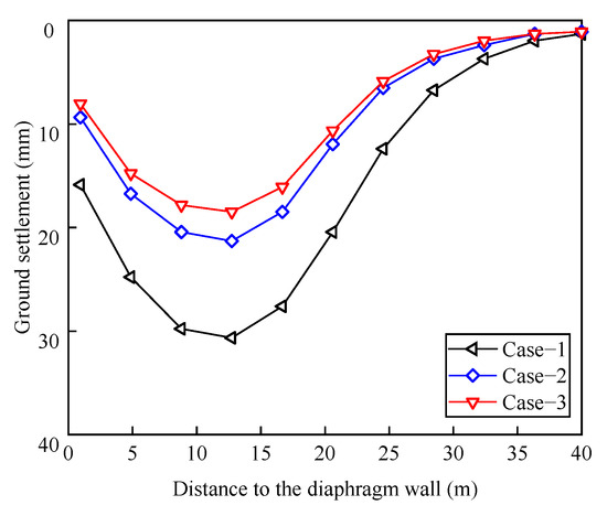 The ground settlement curves were shown in Figure 10. After the foundation pit excavation, the maximum ground settlement without grouting was 30.3 mm. With the first-row grouting reinforcement scheme, the maximum ground settlement decreased to 20.8 mm, reducing by 9.5 mm or 31.4% compared to the no-grouting scheme. With the second-row grouting reinforcement, the maximum ground settlement further decreased to 18 mm, reducing by 12.3 mm or 40.5% compared to the no-grouting scheme. As the number of grouting rows increased, the rate of soil settlement gradually slowed, and the position corresponding to the maximum settlement remained unchanged. This shows that while the double-row grouting scheme provided the most effective control of ground settlement, the reinforcement efficiency of the single-row grouting scheme was still higher than that of the double-row grouting scheme.