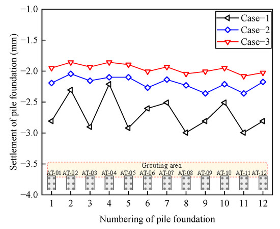 Figure 11 shows the maximum settlement of each pile cap under different grouting schemes. Overall, the maximum settlement values of the pile caps were relatively scattered. The AT-11 cap had the highest settlement without grouting reinforcement, reaching 3.1 mm. After adopting the first-row grouting scheme, the settlement was reduced to 2.4 mm, a reduction of 0.7 mm or 22.6% compared to the no-grouting scheme. With the second-row grouting scheme, the settlement further decreased to 2.08 mm, a reduction of 1.02 mm or 32% compared to the no-grouting scheme. In general, the settlement deformation of the caps was significantly reduced after grouting reinforcement. The pile settlement curve gradually became smoother, and the uneven settlement between adjacent caps decreased with the increase in grouting rows, which is critical for ensuring the stable operation of the elevated lines.