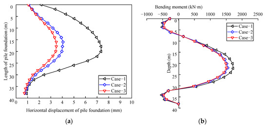 Figure 12. Distribution of horizontal displacement and bending moment of the foundation pile: (a) horizontal displacement; (b) bending moment.