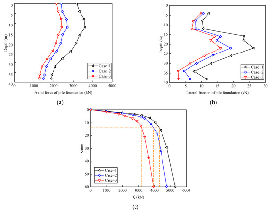 Figure 13. Mechanical characteristics of the foundation pile: (a) axial force; (b) pile-side friction; (c) Q-S curve.