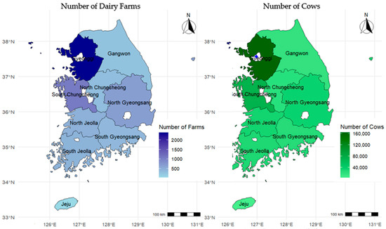 The data for our analysis was sourced from a facility and equipment survey for the Korean livestock industry conducted by the Korea Rural Economic Institute (KREI) in 2021 [39]. The full survey included 1017 beef, pork, and dairy farms, and the number of dairy farms included in the survey was 177. In 2021, there were a total of 6105 dairy farms in Korea, raising 400,798 dairy cows. The average number of cows per farm was 68, and each farm produced an average of 913 kg of milk per day. The average milk production per cow was 27.4 kg [40]. In the same year, the total milk production was 2035 million tons at the industry level. The regional distribution of dairy farms and dairy cows is shown in Figure 1.