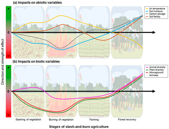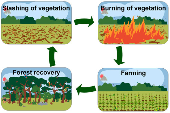 Despite the key role played by SBA for people’s livelihood, our understanding of the environmental impacts of SBA remains limited. For one, although this agroecosystem involves four major stages (i.e., slashing of vegetation, burning of vegetation, farming, and forest recovery) (Figure 1), most studies have only assessed the effects of a single stage (e.g., burning of vegetation or forest recovery) [10,11]. More importantly, SBA not only causes environmental changes at the local (stand) scale, as it is usually studied [12], but its effects can be noticed beyond the limits of the cultivated field, shaping abiotic and biotic factors at the landscape scale [13]. Here, we filled these knowledge gaps to have a more comprehensive understanding of the environmental impacts of SBA across the world’s tropics.