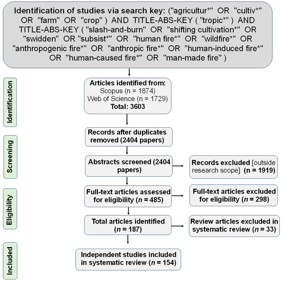 To compile the available studies on SBA effects across the tropics, on 10 August 2023, we searched for studies indexed in the Scopus and Web of Science databases. We used the following search string: (“agricultur*” OR “cultiv*” OR “farm” OR “crop”) AND TITLE-ABS-KEY (“tropic*”) AND TITLE-ABS-KEY (“slash-and-burn” OR “shifting cultivation*” OR “swidden” OR “subsist*” OR “human fire*” OR “wildfire*” OR “anthropogenic fire*” OR “anthropic fire*” OR “human-induced fire*” OR “human-caused fire*” OR “man-made fire”). This search produced 2404 studies, spanning from 1951 to 2023. We then filtered the studies using the following criteria. First, the studies should have been carried out in lowland (<1100 m.a.s.l.) tropical xeric shrublands and woodlands, tropical pluviseasonal forests, and/or tropical rainforests, i.e., between the latitudes of 23.5° N (the Tropic of Cancer) and 23.5° S (the Tropic of Capricorn). We focused on lowland forests to avoid confounding factors (e.g., steep slopes and temperature reductions) associated with altitude. Second, SBA should encompass annual or semi-permanent subsistence crops (i.e., mixed crops of bean, maize, pumpkin, cassava, upland rice, or banana), so we excluded studies on monocultures for commercial purposes (e.g., oil palm, coconut, cashew, and home gardens). Third, the studies should have assessed at least one abiotic (e.g., physicochemical characteristics of the soil and climate) or biotic (e.g., ecological patterns and processes) response to SBA. Fourth, we excluded all studies that evaluated the effect of SBA related to other productive activities such as livestock grazing. In fact, we excluded all studies not explicitly stating that SBA was the type of disturbance analyzed. After this filtering, we performed a careful reading of 187 independent studies of SBA effects in the tropics, which included 154 case studies and 33 reviews (Figure 2) published between 1986 and 2023 (Figure 3).