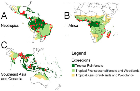 Geographic distribution of 154 studies (red dots) on the abiotic and biotic impacts of slash-and-burn agriculture across the Neotropics (A), Africa (B), and Asia and Oceania (C). Ecoregions based on categorization by Loid et al. (2023) [23].