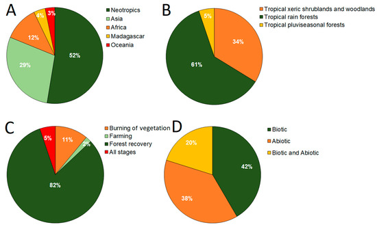 Distribution of studies on the effect of slash-and-burn agriculture by study region (A), forest type (B), stage of the slash-and-burn cycle examined (C), and response type (D).