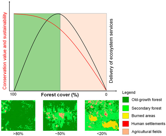 In summary, SBA generates complex landscape mosaics, comprising a variety of land uses. Landscape ecology research suggests that the conservation value and sustainability of these landscape mosaics is contingent upon their spatial composition, exhibiting the highest values in landscapes that are predominantly covered by old-growth forest, and a relatively high value in landscapes with an intermediate percentage of old-growth forest cover [19] (Figure 6). Nevertheless, one may reasonably argue that the conservation value and sustainability of SBA may decline significantly in landscapes that have lost most (>70%) of the original old-growth forests [13,14,19], as this compositional pattern results in considerable abiotic (e.g., environmental stress) and biotic (e.g., loss of forest species) impacts. As the delivery of ecosystem services is contingent upon a human presence to receive them, it may reach a peak in landscapes with an intermediate deforestation level [19] (Figure 6). However, increasing human population pressures in the landscape may subsequently result in a decline in the provision of ecosystem services (Figure 6).