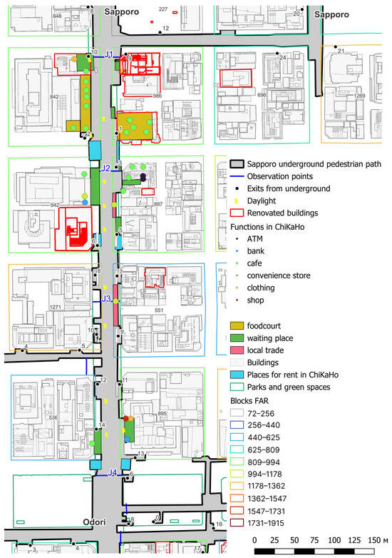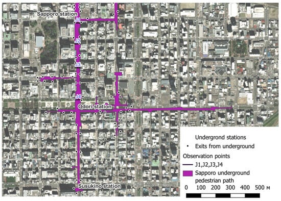 The study was conducted in Sapporo, a city in Hokkaido, Japan. It is located in a cold climate and subject to high levels of precipitation (snow) in winter. In 2011, as part of the Sapporo City Center Revitalization Project [30], the underground pedestrian path ChiKaHo (Figure 1) was built to connect Sapporo and Odori Stations (Odori Park is an open public space with a length of 1625 m). The length of the ChiKaHo underground space is 521 m from point J1 (Sapporo Station) to J4 (Odori); its orientations from the north to south distances between points J1 and J2, between J2 and J3, and between J3 and J4 are 143, 162 m, and 217 m, respectively.