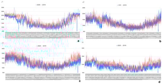Comparison of 2019 pedestrian traffic in ChiKaHo and 2020 in four observed locations. (a)—Pedestrian flow in 2019 and 2020 at point J1. (b)—Pedestrian flow in 2019 and 2020 at point J2. (c)—Pedestrian flow in 2019 and 2020 at point J3. (d)—Pedestrian flow in 2019 and 2020 at point J4.