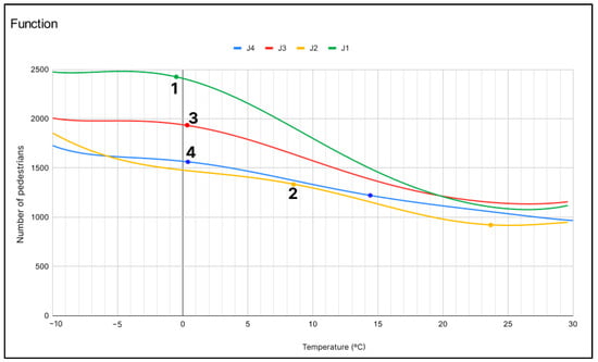 Functions of pedestrian number per location and temperature changing points across 4 years of observation (average; 2019–2022) from 9:30 to 16:00. 1—Changing Temperature Point for J1. 2—Changing Temperature Point for J2. 3—Changing Temperature Point for J3. 4—Changing Temperature Point for J4.