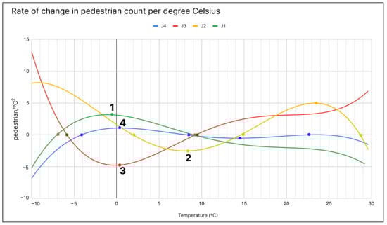 The rate of change in the number function of pedestrian over a 15-minute interval from the temperature for each of the points is described by the second derivative of the 6th degree polynomial function (Figure 5 and Figure 6). An analysis was conducted on the points, and the second derivatives of function per year and on average were constructed. The result indicates that the average fits into the total range of 4 years for each of the points. For J1, the period of major changes in the number of pedestrians occurs at temperatures from −2 °C to +1.2 °C (point 1 in Figure 5 and Figure 6; average, −0.5 °C). For J2, two-to-three points of change can be observed depending on the year (point 2 in Figure 4 and Figure 5); in the plus zone, the most significant changes occur at a temperature of +6.8–11.6 °C (average: 8.5 °C), and the second point is +22.8–23.7 °C (average: 23.7 °C). For J3, the minimum number of temperature points of change is two: the first period is from −2 °C to +4.4 °C and +10–13.2 °C, but the average for 4 years is one point +0.3 °C (point 3 in Figure 4 and Figure 5). Two tipping temperature points were identified for J4 ranging from +1.2 °C to 2.8 °C (point 4 in Figure 4 and Figure 5) and from 9.2 to 16 °C (average, +0.4 °C and +14.4 °C; Table 3, Table 4, Table 5 and Table 6).