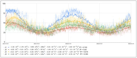 To aggregate data (average) per day according to temperature (Figure 3), the study identified a polynomial function for each observed point in underground space across the 4 years.