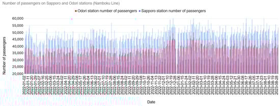 By analyzing data on daily passenger use for Odori Station and the Sapporo Namboku Line (August 2021–August 2023; Figure 8), the study found that Sapporo Station has a higher passenger flow and that the dynamics of changes in the same time periods are similar with those of the Odori Station, that is, an increase in passenger flow in December and early February, with a sharp decrease in early January, early May, and mid-August, coinciding with national holidays and festivals [52].