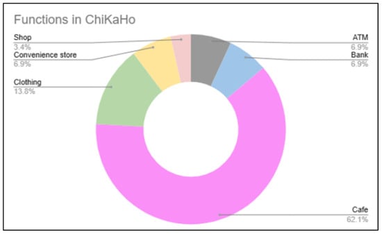 In winter, the underground space sufficiently covers daily basic needs without the need to go to the surface: the highest concentration of public functions (number of spots) is located in areas from J1 to J2 (up to 50 m in the direction of Odori), which comprise more than 82% of the total number of services in ChiKaHo. In particular, 66% of the services located in this area are catering cafes (Figure 9). In addition, two clothing and shoe stores exhibit direct access from ChiKaHo, a market for local small businesses, convenience stores, and financial services: one bank and two ATMs. J3 is located in the center of the market, where local craftsmen are represented. The next service area is located near exploration point J4 in Odori Station; it includes a cosmetics and perfume store, a convenience store, a cafe market, and a bank branch. The diagram presents the total number of services as percentages.