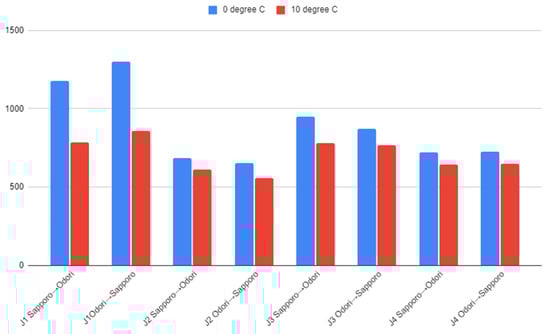 Out of the four points, J1 (the southern exit of Sapporo Station) exhibited a decrease in the number of pedestrians during spring, which begins at a temperature of −2 °C + 1.2 °C. For J2, the temperature range is significantly shifted to the plus zone: +6.8–11.6 °C. For J3, it ranges from −2 °C + 4.4 °C to +10–13.2 °C. J4 (Odori Station) has two temperature intervals in changing pedestrian behavior: +1.2–2.8 °C and 9.2–16 °C.