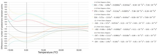 Pedestrian flow at all four points behaves differently according to season. If the correlation between changes in pedestrian flow and ambient temperature throughout the year is considered, then J1 displays a high negative correlation, ranging from −0.859 to −0.927; J3 shows a moderate correlation, from −0.743 to −0.83; J2 shows a medium correlation, from −0.671 to –0.789; and J4 shows a low correlation, from −0.627 to –0.761 (Figure 3). The greatest dependence between changes in temperature and pedestrian flow occurs during the transition seasons (spring and autumn), which are characterized by high temperature fluctuations (Figure 7).