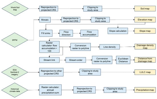 To measure and locate the flood susceptibility, we considered seven factors to derive a first flood susceptibility map, following the recommendation of []: slope, elevation, land use, and land cover, soil, precipitation, distance from the drainage, and drainage density. The data for each of these factors were derived from international databases. Land use and land cover were obtained from the Esri Living Atlas, the rainfall map from the historical data from WorldClimate, and the soil map was acquired from the Harmonized World Soil Database from the FAO. Topographical factors, including slope, elevation, and hydrological factors, including distance from the drainage and drainage density, were deduced from the DEM. The downloaded datasets were processed in ArcGIS Pro and visualized in different thematic maps according to the flowchart depicted in Figure 2.