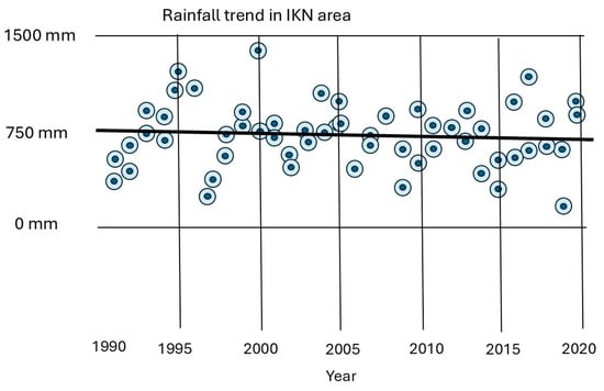 Based on the published data from 1990 to 2020, the annual rainfall in the IKN area varies from 2584.0 mm/year to 2925.2 mm/year, following []. Rainfall increases as the location gets closer to the coastal sea. Over the last two decades, there has been a decreasing trend in rainfall. The highest decrease in annual rainfall is observed in offshore areas, which correspond to high annual rainfall values. The negative trend of yearly rainfall in the IKN can reduce clean water reserves in the region in the next few decades []. Rainfall at IKN also has seasonal and diurnal variations. The peak rainfall occurs in November–December and March–April, while the driest conditions occur in August–October. El Nino can exacerbate this dry season, which increases the potential for droughts and forest fires, as in 2016 [].