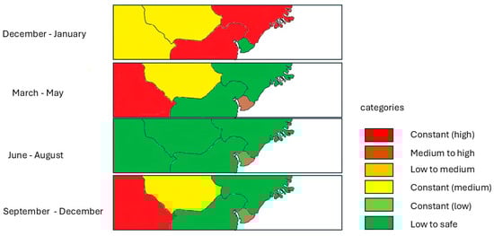 The BMKG data show that in East Kalimantan, the seasonal changes in the daily intensity of precipitation are minimal. It ranges from −0.7mm to 0.2mm under the RCP4.5 and RCP8.5 scenarios. For the RCP8.5 scenario, BMKG predicts a percentage change in the seasonal total precipitation in the IKN area. The forecast changes apply from March to April and December. For March to April, the change is −2.898%, indicating a decrease in seasonal precipitation. The change is 1.653% from December to February, indicating increased seasonal rainfall. There are no spatial differences within the IKN area. Figure 5 displays the BMKG predicted flood risk in the area on a seasonal basis considering variations throughout the year. December to February is the peak flood risk season with high flood risk, characterized by heightened water levels and potential overflows of rivers or other water bodies. The other months of the year have a relatively low flood risk.