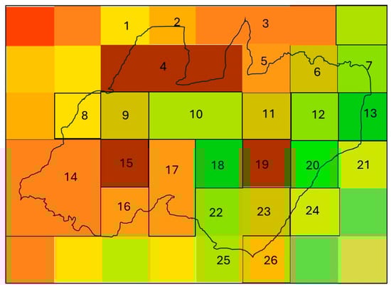 Given that currently, the resolution of rainfall data collection remains limited (due to very few collection points in the entire area), any management strategy for mitigating and harvesting is dependent on this resolution. We decided, therefore, to use the data collection resolution as a basis for creating a rainwater management system. The current resolution of the rainfall data is the 10 km × 10 km grid, which would lead to a spatial basis for different rainwater management strategies (namely, a separate management strategy for each square in this grid). Figure 7 displays the resulting rainwater management units, whereby the minimum size is 10 km × 10 km, but also some spatial units are consolidated, either because they fall partly outside of the anticipated IKN area or because the rainfall characteristics show a very low degree of variety, and thus can rely on a single rainwater management strategy.