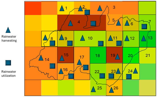 Proposed spatial distribution of rainwater management facilities (visual adaptation from findings of GEE). The numbers refer to Land Units of Table 3.