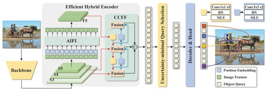 For the neck network, the Flying Paddle team designed a series of encoder variants to verify the feasibility of decoupling intra- and inter-scale feature interactions and eventually evolved into an efficient hybrid encoder, which consists of an attention-based intra-scale feature interaction (AIFI) module and a CNN-based cross-scale feature-fusion module (CCFM). The efficient hybrid encoder in RT-DETR can efficiently process multiscale features, which are processed by decoupling the interactions within a single scale and cross-scale fusion. After extracting the multi-scale feature maps from the backbone network, only the feature map with the smallest scale (S5 in Figure 2) is used to do the multi-head self-attention processing. The output is used to do feature fusion with the other two scaled feature maps (S3 and S4 in Figure 2) in the CCFM module.
