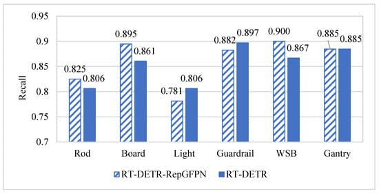 As evidenced in Table 4, the model RT-DETR-RGFP demonstrated an improvement in the detection Recall rate, accompanied by a corresponding reduction in precision. The mean average precision was enhanced by 1.2%. Overall, an improvement in the detection model was not obvious. A further comparison of the detection recall of each target type is presented in Figure 9.