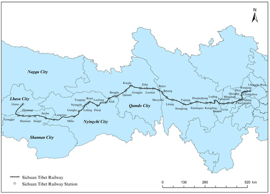 The Sichuan–Tibet Railway is the railway connecting Tibet and Sichuan Province. It is the second railway providing access to Tibet from mainland China (Figure 1). The Sichuan–Tibet Railway starts in Chengdu, Sichuan Province, and ends in Lhasa, Tibet, with a total design length of 1588 km and a design speed of 120–200 km/h. As of 2023, the Sichuan–Tibet Railway is being constructed and operated in stages, with the section of Chengdu-Ya’an railway and Lhasa-Nyingchi railway already operational. According to its plan, once fully operational, the Sichuan–Tibet Railway will significantly reduce the transport cost for Tibet, improve the regional railway network layout, and boost the overall transportation service capacity of Tibet. Therefore, a scientific analysis of the accessibility improvements brought by the Sichuan–Tibet Railway holds important practical significance.