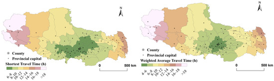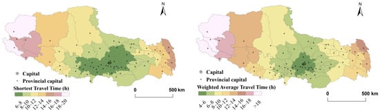 Before the opening of the Sichuan–Tibet Railway, the overall travel time within Tibet was relatively high, indicating poor accessibility. The average shortest travel time within the region was 9.8 h, and the weighted average travel time was 8.9 h. The spatial distribution of accessibility formed an irregular ring pattern, with Lhasa as the core, gradually expanding outward to the peripheral areas (Figure 2).