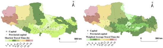 Once the entire Sichuan–Tibet Railway is fully operational, the internal travel time in Tibet will see a significant reduction, and the areas with high accessibility will expand. The overall level of accessibility will greatly improve, with the average shortest travel time between counties reducing by 40%, shortening to 5.8 h. From the perspective of weighted average travel time, 80% of the region will experience a reduction of 2–5 h, and 20% will see reductions of more than 5 h, with the average travel time falling to 4.8 h. Among these, the accessibility of Lhasa, Nagqu, Shigatse, and Nyingchi will be significantly higher than in other areas, with shortest travel times ranging from 3 to 4 h and weighted average travel times between 1 and 4 h. Although the accessibility in other regions will also improve, the gap between these areas and the core regions with dense transportation networks will further widen. The spatial distribution of accessibility forms a pattern radiating outward from the areas along the Qinghai–Tibet and Sichuan–Tibet Railways (Figure 4).