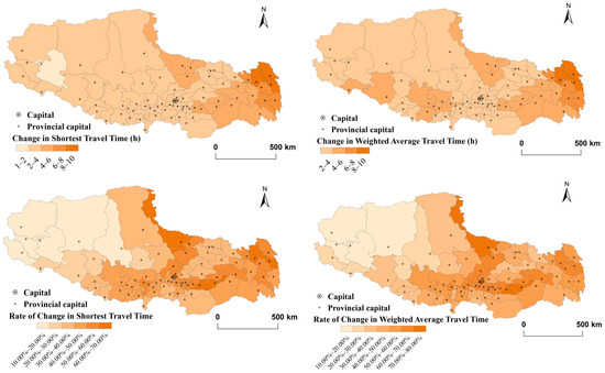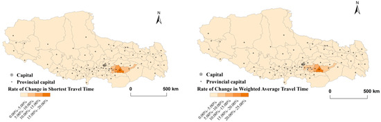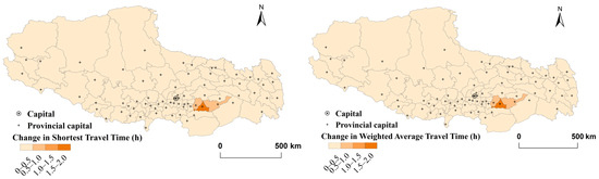 The main stations along the Lhasa–Nyingchi Railway line of the Sichuan–Tibet Railway include Lhasa, Nyingchi, Milin, Lang, and Gongga. After the operation of the railway, the accessibility of the regions along the railway, such as Nang County, Gyaca County, Mainling County, Sangri County, Qusum County, and Medog County, saw significant improvements, with the shortest travel time and weighted average travel time both improving by more than 30 min. The average shortest travel time in Tibet decreased from 9.80 h before the opening to 9.63 h, having a relatively small impact on the overall internal accessibility of the region (Figure 3).