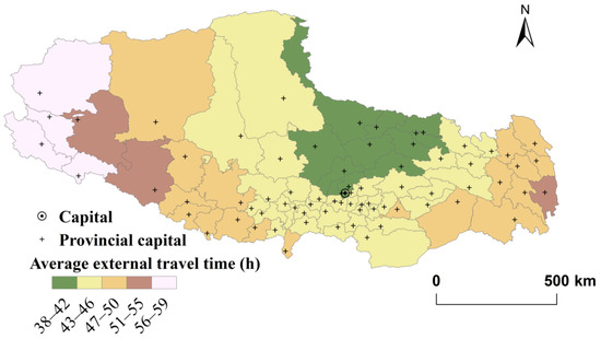 Before the Sichuan–Tibet Railway’s inauguration, Tibet’s 74 counties and China’s 4 municipalities, 6 national capital cities could be reached by train in an average of 45.7 h. Low-value areas were mainly concentrated in Nagqu and Lhasa, which lie along the Qinghai–Tibet Railway, indicating relatively good external accessibility due to the clear directional nature of the transportation artery. High-value areas were concentrated in the peripheral cities, such as Ngari and Chamdo, where external accessibility was poor, mainly due to their distance from central cities, more challenging natural conditions, and greater difficulties in road construction. The spatial pattern of average external travel time formed a radiating pattern centered on Nagqu, with values gradually increasing toward the peripheral areas, showing an east–west radiation pattern along the Qinghai–Tibet Railway (Figure 7).