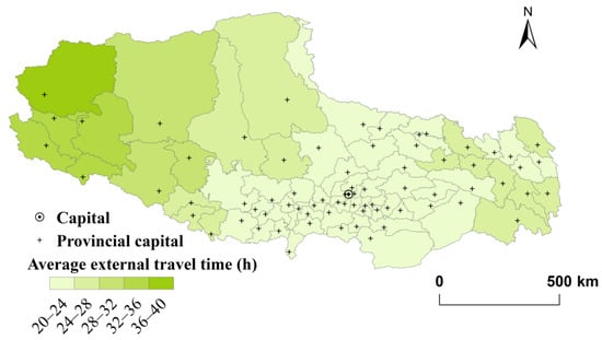 After the opening of the Sichuan–Tibet Railway, the average external travel time by rail decreased to 23.7 h, with an average improvement of 22 h. More than 70% of the region will see external travel times reduced to less than 24 h, significantly improving the overall level of external accessibility. With the continued improvement in the railway and highway network, the external accessibility of peripheral areas far from central cities also significantly improves. From a spatial perspective, the directional nature of transportation arteries becomes more prominent after the opening of the Sichuan–Tibet Railway. Regions along and near the railway will generally have lower external travel times, while the values increase as the distance from the railway grows, with the highest values found in peripheral areas. The external accessibility will still be centered around Lhasa, Nagqu, Shigatse, and Nyingchi, with accessibility levels decreasing outward from these cities (Figure 8).