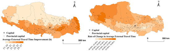 In terms of the magnitude and rate of improvement in external accessibility, the areas with the greatest improvement are concentrated in the southeastern and southwestern parts of Tibet, particularly in areas with relatively poor external accessibility before the railway’s opening. Ngari, in the western part of Tibet, will experience the greatest improvement in average external travel time, with a rate exceeding 60%, reflecting the significant impact of the railway in improving the external accessibility of peripheral areas and reducing their locational disadvantage [33]. Other areas will also see improvement rates of over 40%, indicating that the opening of the Sichuan–Tibet Railway can significantly improve external transportation conditions and greatly promote communication between Tibet and central and eastern regions (Figure 9).