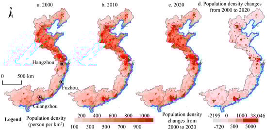 Spatial distribution of population density in 2000, 2010, and 2020.